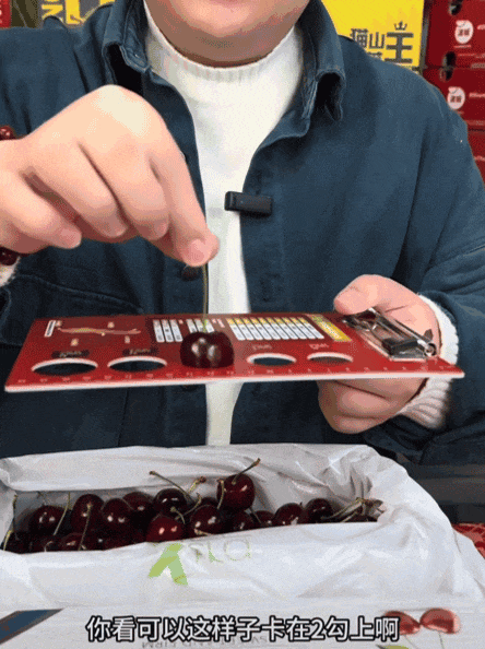 最简单就是正在尺度上做文章。比若有生果博从就揭秘,测试车厘子大小的卡纸上,2J的车厘子是达到不了3J尺度的,但稍微换个角度就能够卡住。有一些曲播间就会用这种体例偷梁换柱,抬高价钱。