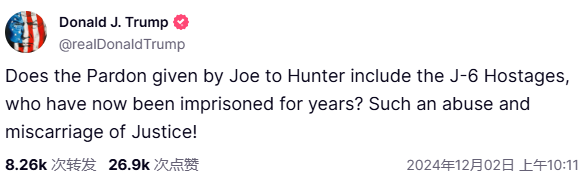 赦宥令发布后,特朗普的反映并不令人不测。他正在社交发文称这是“”,何时赦宥2021年袭击美国大厦的人。党浩繁议员也纷纷,称“拜登家族从头到尾都正在撒谎”。